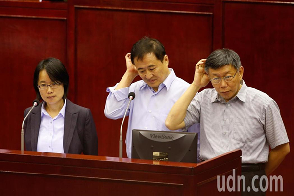 針對北農是否送洋酒給民進黨臺北市黨部,北農總經理吳音寧(左起)、董事長陳景峻與市長柯文哲下午在臺北市議會接受質詢,吳音寧明確表示,沒有。(圖片來源:臺灣《聯合報》)