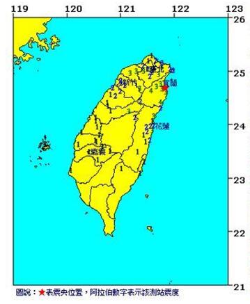 臺(tái)灣氣象主管部門(mén)指出,各地最大震度為宜蘭縣牛斗4級(jí),宜蘭市3級(jí),新北市3級(jí),臺(tái)北市3級(jí),桃園市3級(jí)。