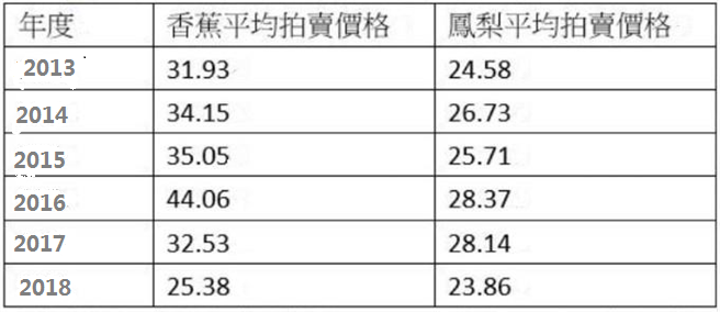 北農近年來拍賣香蕉、菠蘿平均價格。(數據源:臺北農產運銷公司 單位:元新臺幣/公斤)