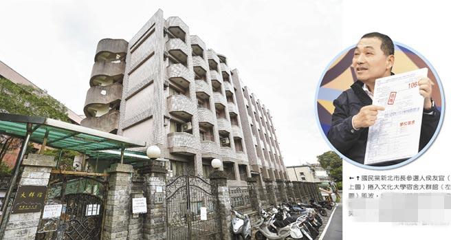 國民黨新北市長參選人侯友宜(圓圖)卷入文化大學宿舍大群館風波。(圖片來源:臺灣《中時電子報》)