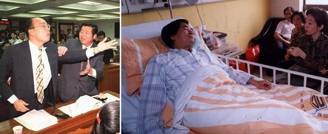 1993年因陳水扁在“立院”說“養(yǎng)榮民等于養(yǎng)豬”,韓國瑜氣得當場臭揍陳水扁,把其打得住院三天。(臺媒合成圖)