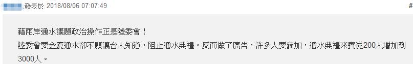 這就不得不提臺當局先前的政治操作。據《中時電子報》7月31日報道,通水典禮早定于8月5日舉行,臺灣陸委會7月27日卻突然“建議”延后,理由是“時機不宜”。直接背景是日前東亞青年運動會在臺中市的舉辦權被取消,臺當局歸咎于大陸“打壓”,欲借機“反制”。民進黨隨后遭輿論痛批枉顧民生。金門縣政府認為,兩岸通水是金門民眾的首要民生大事,不應泛政治化,堅持如期舉辦通水儀式。
