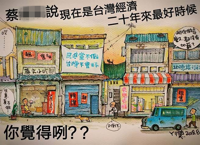雖然蔡英文在許多場(chǎng)合中強(qiáng)調(diào)臺(tái)灣經(jīng)濟(jì)好,但各行各業(yè)仍叫苦連天。對(duì)此,“阿德漫畫”則在臉譜網(wǎng)畫出一張漫畫,圖中的房子有許多都貼著租、售、轉(zhuǎn)讓等字樣,還有人喊著“生意真歹做”“啊你做這么久,都沒有加薪?”此外,近日的夾娃娃機(jī)風(fēng)潮也在圖中;“民進(jìn)黨不倒,臺(tái)灣不會(huì)好”的海報(bào)高高掛起。“阿德漫畫”諷刺表示,臺(tái)灣經(jīng)濟(jì)20年來最好狀態(tài)?有沒有到街上看過?