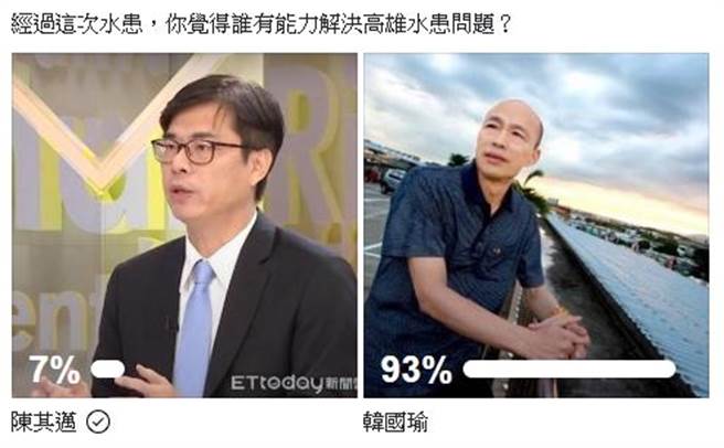面對兩位候選人所提出的治水政策,Facebook社團“歷史的鏡像”發起了一項投票,主題為“經過這次水患,你覺得誰有能力解決高雄水患問題?”沒想到韓國瑜竟拿下高達93%的超高支持率。此次水患似乎也淹掉了高雄人對民進黨的支持。(中國臺灣網 李寧)