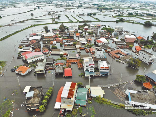 暴雨重創(chuàng)南臺灣,嘉義縣東石鄉(xiāng)掌潭村淹水嚴(yán)重。(圖片來源:臺灣《中時電子報》)