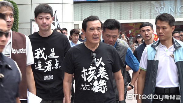 馬英九穿上“我是人,我返核”黑衣上街頭發(fā)聯(lián)署書。(圖片來源:臺灣“東森新聞云”)