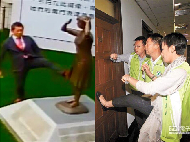 名嘴謝寒冰將日本人腳踹銅像照片對比邱議瑩的“屏東無影腳”。(圖片取自臺媒)