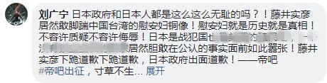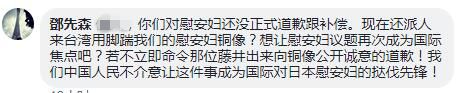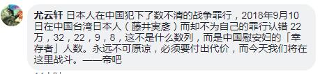 有網(wǎng)友留言向日本喊話(huà):你們對(duì)慰安婦還沒(méi)正式道歉跟補(bǔ)償。中國(guó)人民不介意讓這件事成為國(guó)際對(duì)日本慰安婦的撻伐先鋒!