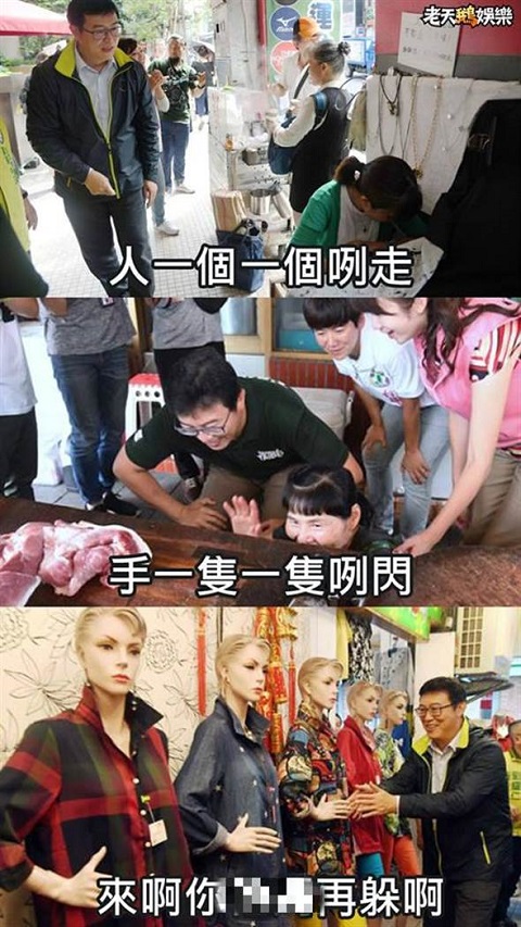 臉譜網粉絲專頁“老天鵝娛樂”也PO出一張圖,并且搞笑加注旁白,因為前面的人都閃躲避開握手,所以打趣姚文智與假人握手的行為,是因為這樣這些“假人”躲不開了。“老天鵝娛樂”也開酸:“文智已經放棄治療了”。