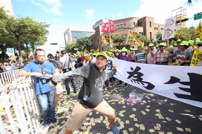 漁民在臺當局“農委會”前灑冥紙抗議。(圖片來源:臺灣“中時電子報”)
