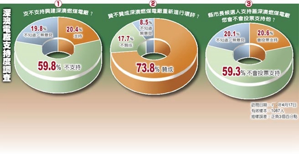 有意思的是,在被問到年底選舉將至,如果縣市長候選人支持深澳電廠,會不會投票給他?近59.3%的人表態(tài)不支持,其中有77.4%的泛藍選民表示不會投給支持深澳的候選人,泛綠選民也高達43.9%;至于沒有藍綠傾向的選民,也有53.5%不會投給支持深澳電廠的候選人。