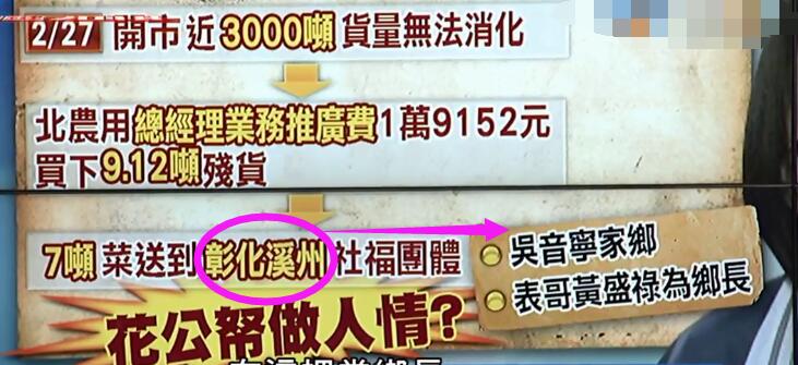 但可笑的是這筆所謂做公益的錢并不是從吳音寧自己腰包里掏出來的,而是動用了“北農總經理室的業務推廣費”;更有趣的是,國民黨臺北市議員王欣儀發現,這9.12噸里有逾7成的蔬菜被送到了吳音寧的老家、其堂哥擔任鄉長的彰化溪州,于是不禁質疑吳音寧是公器私用,“慷全民之慨做個人人情”。