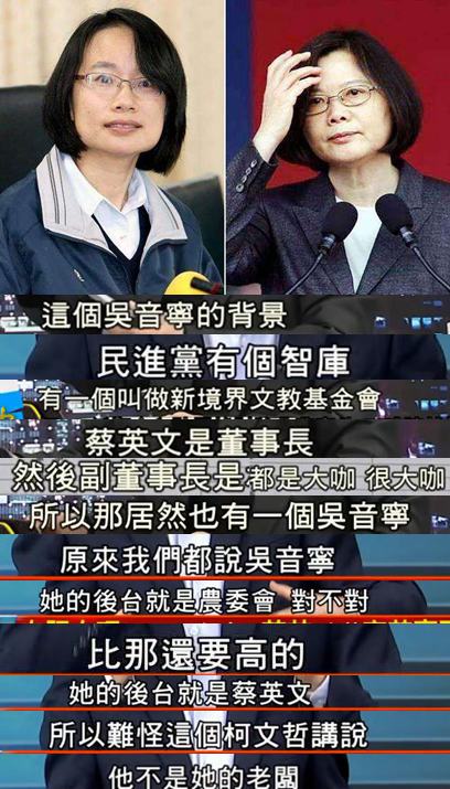 難怪吳音寧就算再無腦、再出包,柯文哲也好,北農董事長陳景峻也罷,都不敢動她分毫,因為他們都不是她真正的老板嘛!