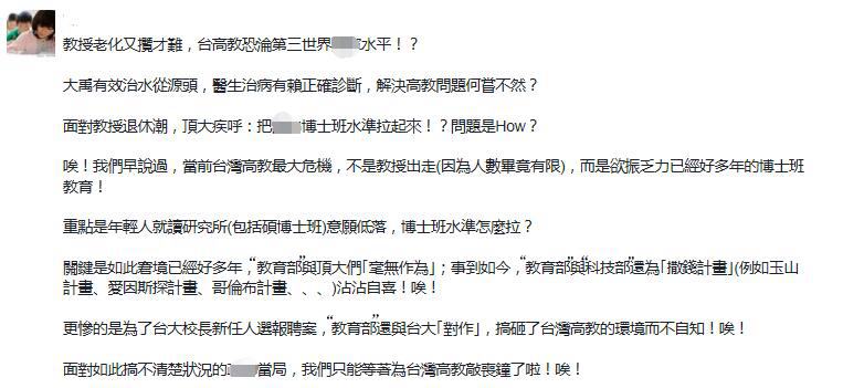 郭大維也指出,近年來全世界一流大學皆投入更多資源、進步也很快,但臺當局對頂大的支持度卻下降,這樣下去“有可能未來臺灣再也沒有任何一所一流大學”。