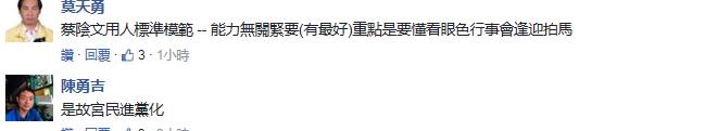 不少網友表示“這就是蔡英文的用人模范啊”、“故宮‘民進黨化’了啊”……