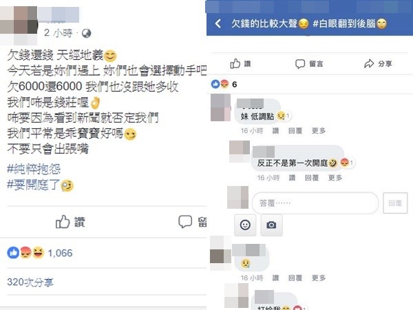 事后,其中一名霸凌女子在臉譜網(wǎng)貼文指出,欠錢(qián)還錢(qián),天經(jīng)地義,今天若是你們遇上,你們也會(huì)選擇動(dòng)手吧,欠6000還6000,我們也沒(méi)跟她多收,我們不是錢(qián)莊喔,不要因?yàn)榭吹叫侣劸头穸ㄎ覀儯覀兤匠J枪詫殞毢脝幔灰粫?huì)出張嘴。貼文引來(lái)眾多網(wǎng)友圍剿,可是女子卻反嗆“我們家也是有錢(qián)請(qǐng)律師的喔。”