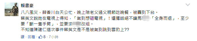 還有人認為,“既然沒有職權,那就干脆下臺。”“當初因為薛香川,蔡英文曾氣的想砸電視,看來這次坐著裝甲車勘災,是被陳建仁氣到跳腳了吧。”“果然,建仁就是矯情!”