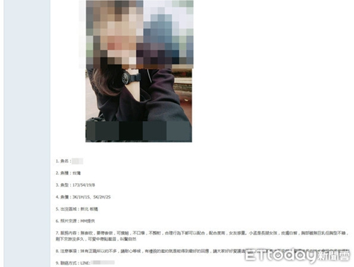 更離譜的是,該士官從今年起陸續在情色網站上張貼雙北市和中部年輕賣淫女子訊息,并以網絡論壇金幣等收取費用,提供尋芳客這些援交妹手機號碼、LINE帳號供有興趣民眾自行致電賣淫妹相約交易地點、商議價格。但新北市有警方日前執行網絡巡邏時發現,其中一名昵稱小雅的援交妹照片神情實在太年輕,認為該論壇及刊登者已經觸犯少兒性剝削條例。