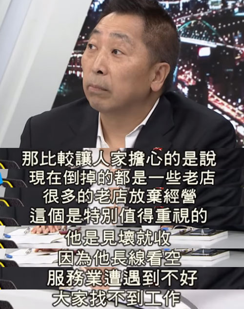 隨著島內年輕人背井離鄉外出謀生,老飯店及商圈業者紛紛求售倒閉,業者投資血本無歸……這些無不反映了臺灣的經濟現狀,從臺北到高雄,從花蓮到墾丁,幾乎整個臺灣的服務業都步入了寒冬,而這場災難還遠沒有結束……