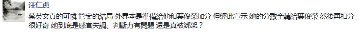 還有人覺得葉俊榮此舉其實是為蔡英文“加分”的,且明明是兩個人唱的雙簧,她卻裝無辜……