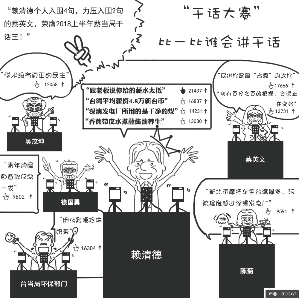 據(jù)臺灣《中時電子報》報道,蔡英文當局上臺兩年多來,讓人印象深刻的并非政績,而是讓臺灣人民惱怒的干話(空話、套話),被戲稱為“干話產(chǎn)生器”。而且官員們似乎在進行“干話大賽”,比賽誰最會“講干話”。