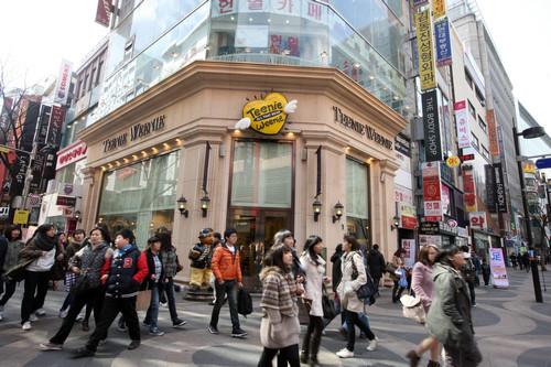 資料圖片:2011年3月2日,人群經過韓國首爾明洞購物區的一家服裝店門口。新華社記者 何璐璐 攝