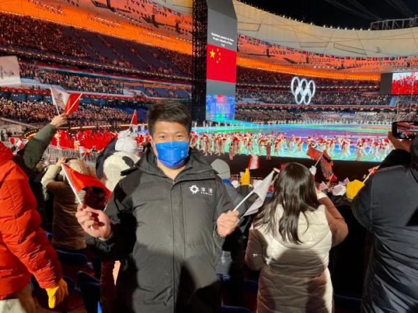 2月4日,臺籍教師陳文成在現場觀看北京冬奧會開幕式。(受訪者供圖)