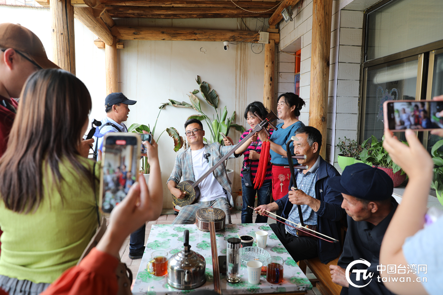 “轉(zhuǎn)軸撥弦三兩聲,未成曲調(diào)先有情。”在武威涼州賢孝非遺傳承人賈旭峰的院子里,兩岸媒體人圍著幾位民俗表演藝人而坐,聽涼州賢孝的傳承與發(fā)展,感受中華民俗文化的魅力。在記者提議下,由賈旭峰以武威當(dāng)?shù)乜谝粞莩_頭,現(xiàn)場兩岸同胞合唱膾炙人口的歌曲——《外婆的澎湖灣》。當(dāng)武威口音遇上“臺灣腔”,當(dāng)寶島臺灣的歌曲遇上祖國大西北的特色民俗,一場新奇的文化碰撞上演。院落中一片歡聲笑語,歌聲仿佛穿過海峽,在兩岸回蕩。
