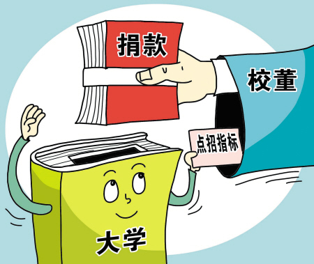 談及高考,人們都知曉其是中國目前最公平的選拔制度,是基于統(tǒng)一考試標(biāo)準(zhǔn)和一整套規(guī)章制度之上,而“點招”則可謂為在高考公平之外存一巨大黑洞。顧名思義,“點招”就是點對點招生,是高校預(yù)留少量機動招生名額,以備所“需”,而能分享這塊稀缺而貴重蛋糕的人自然非比尋常,教職工子女、“校董”子女等才能“近水樓臺先得月”。尤其是“校董”,用巨額金錢敲開知名高校大門,獲得相應(yīng)的“點招”指標(biāo),可給自己的孩子、親屬用,也可送給生意伙伴或有所求的官員。大學(xué)的聲譽、優(yōu)良教育資源淪為赤裸裸的金錢買賣。