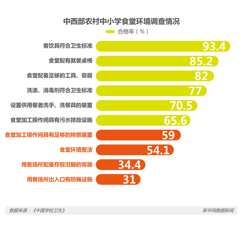 我國中西部農村中小學食堂普遍存在衛生與管理問題。整體來看,縣城學校的情況要明顯好于農村,而中部城市在部分指標卻落后于西部城市,高中學校食堂衛生條件整體看要好于小學、初中。