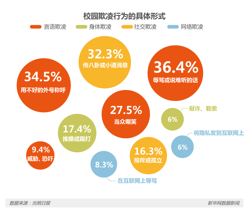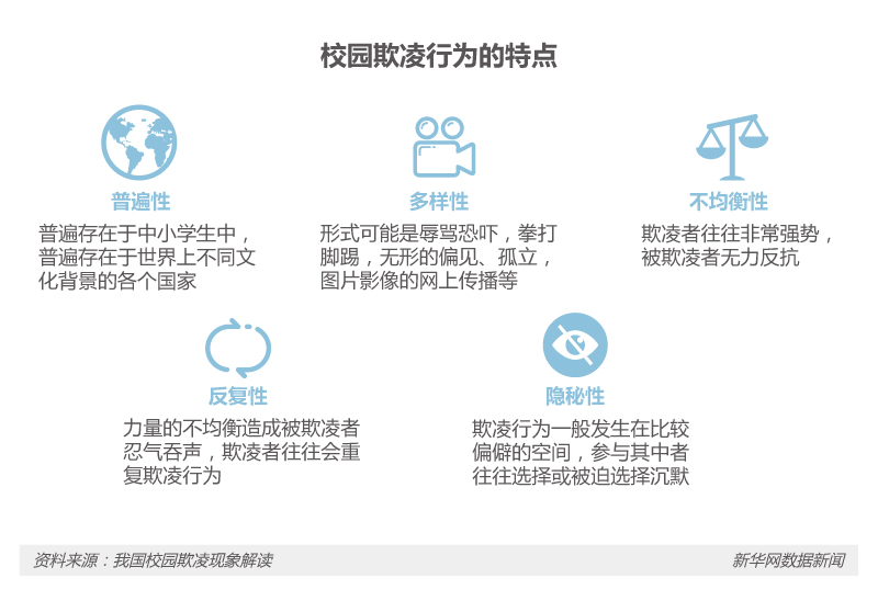 資料來源:新華社,教育部,聯合國兒童基金會,《我國校園欺凌現象解讀》,《校園欺凌受害者生存狀況調查報告》,光明日報