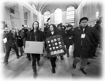 圖為2月9日,美國紐約,多個社會團體的抗議者到紐約中央車站旁的蘋果專賣店,遞交請愿書,呼吁蘋果公司改善海外代工廠的工作環(huán)境。