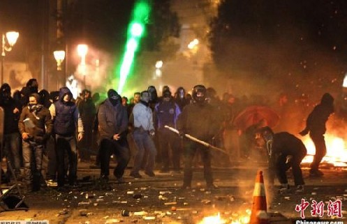 當(dāng)?shù)貢r(shí)間2月12日,希臘議會(huì)通過總額為33億歐元的新緊縮措施。希臘警察和示威者在首都雅典的街頭爆發(fā)了沖突。圖為示威者在雅典市中心向警察投擲石塊。