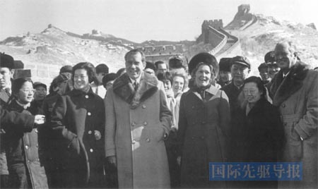 1972年2月24日,美國總統尼克松和第一夫人帕特·尼克松在中國長城上和一群人合影。圖片:美聯社