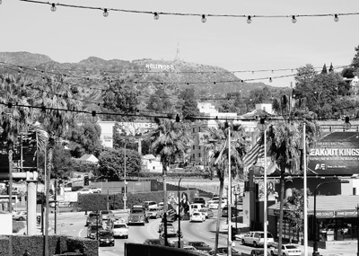 從奧斯卡獎的頒獎地好萊塢高地眺望遠處山坡上的好萊塢標志。