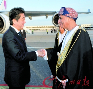 當地時間1月9日,阿曼馬斯喀特,日本首相安倍晉三抵達訪問,受阿曼副首相接待。