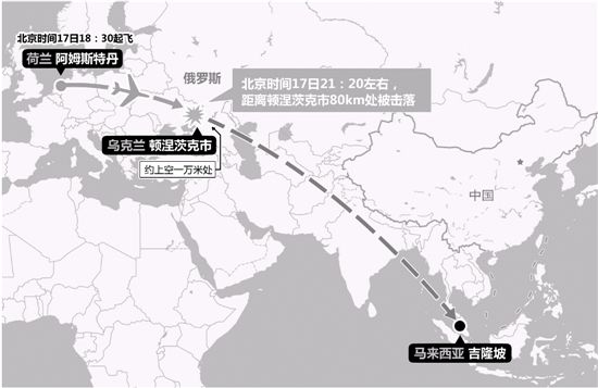 俄羅斯國際文傳電訊社報道說,這家波音客機原定由荷蘭阿姆斯特丹飛往馬來西亞首都吉隆坡。在還有50公里就將進入俄羅斯領空時“開始墜落,而后被發現在烏克蘭境內的地面燃燒”。