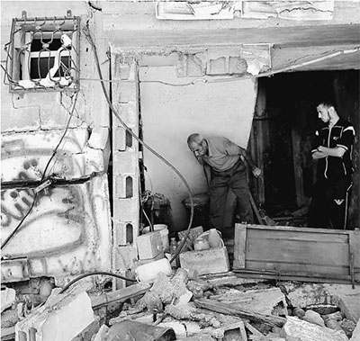 7月17日,在加沙地帶北部,巴勒斯坦人奧馬爾和他的兒子檢查在以色列導(dǎo)彈襲擊中被損毀的自家房屋。新華社發(fā)