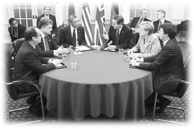 9月4日,在英國威爾士紐波特市,(從左至右)法國總統奧朗德、烏克蘭總統波羅申科、美國總統奧巴馬、英國首相卡梅倫、德國總理默克爾、意大利總理倫齊開會討論烏克蘭局勢。(新華社/ 法新)