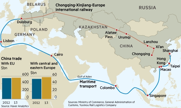 習近平提出這些雄偉構想的一個動機在于,他希望加強中國內地、特別是西部地區與歐洲的聯系。假如這些倡議成真,那或許將相當于自中國20年前開始成為國際貿易的重要參與者以來,全球貿易路線的一次最大洗牌。