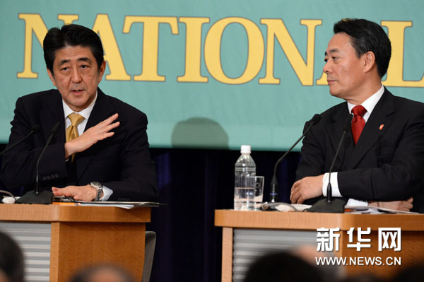 12月1日,在日本東京記者俱樂部,日本首相安倍晉三(左)在討論會上闡述觀點。新華社記者馬平攝