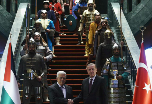 早在阿巴斯訪問土耳其之前,埃爾多安的“兵馬俑真人秀”就曾經被《紐約時報》報道過。去年10月份埃爾多安的新總統官邸剛剛完工,《紐約時報》就刊出了埃爾多安的“新儀仗兵”的相關消息,只不過當時并沒有外國領導人的到來,因此也就沒有引起多少注意。而此次阿巴斯作為外國領導人到訪,埃爾多安意氣風發的于“鐵甲護衛”的簇擁中予以接待,這種“萬國來朝”的過癮和刺激,埃爾多安自己也肯定特別過癮。