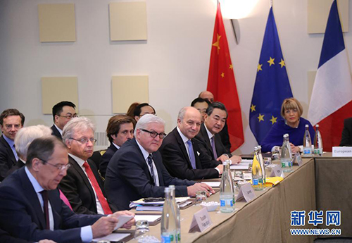 3月30日,在瑞士洛桑,中國外交部長王毅(右二)出席伊朗核問題六國與伊朗外長會。 新華社記者 張淼 攝