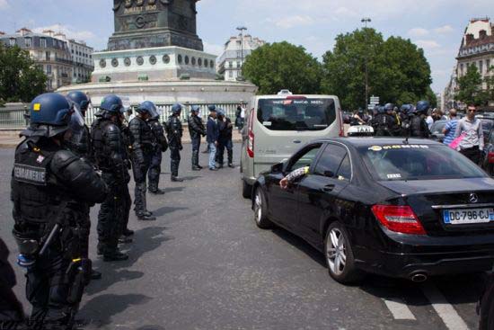 法國巴黎的出租車司機(jī)與優(yōu)步(Uber)專車司機(jī)16日發(fā)生沖突,出租車司機(jī)向?qū)\囃稊S石塊,最后防暴警察出動(dòng)才得以制止事端。