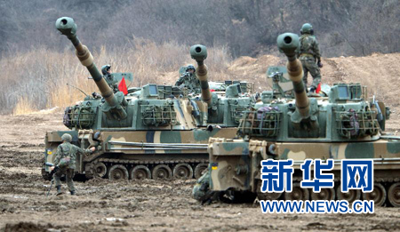 3月7日的美韓軍演中,韓軍投入K9自主炮進行演習。新華社發