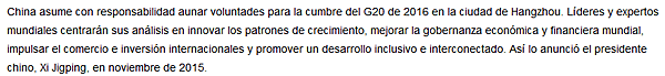 2015年11月,中國國家主席習近平宣布,中國將萬眾一心、負責任地舉辦2016年G20杭州峰會。屆時,各國領導人和專家將共同為如何創新增長方式、改善全球經濟金融治理、推動國際貿易和投資以及促進包容和聯動式發展建言獻策。