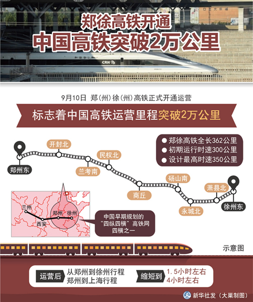 9月10日,鄭徐高鐵開通。中國高鐵里程突破2萬公里。新華社發 大巢制圖