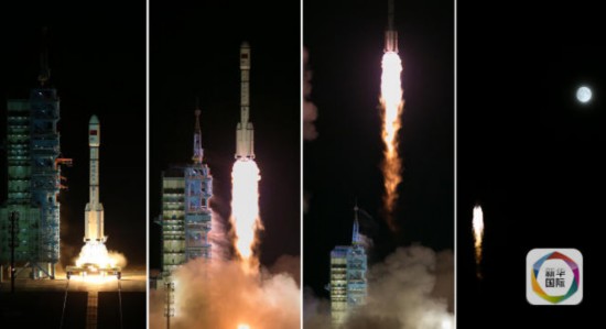 圖為2016年9月15日,中國在酒泉衛星發射中心用長征二號F T2火箭將天宮二號空間實驗室發射升空(拼版照片)。(新華社記者琚振華攝)