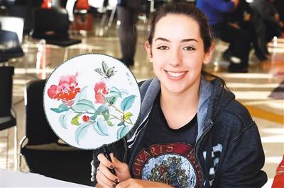 11月14日,一名美國學(xué)生在“中國文化周”活動中展示自己上色的中國團(tuán)扇。