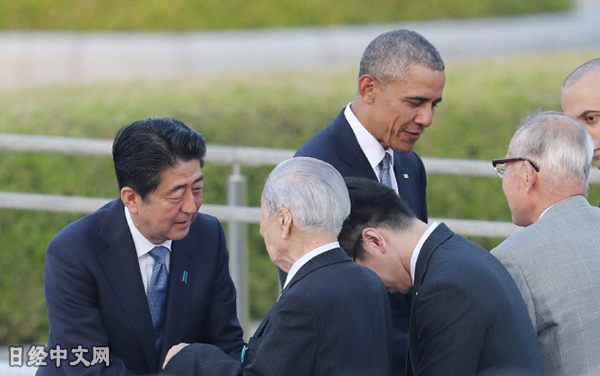 資料圖:2016年5月27日,安倍與奧巴馬在廣島與核爆受害者交談。(《日本經(jīng)濟(jì)新聞》網(wǎng)站)